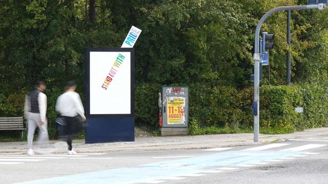 The campaign message was positive, peaceful, and respectful, encouraging everyone to ‘Stand out with Pride’. However, the campaign quickly encountered resistance and vandalism, and although it was repeatedly set up, it was torn down in 2 out of 3 locations.