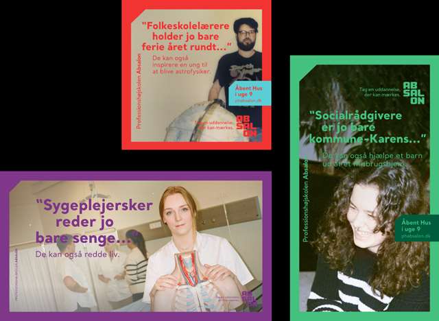 The University College Absalon offers a wide range of welfare education programs, qualifying students to become nurses, schoolteachers, pedagogues, social workers, etc. Although these professions are some of the most important in our society, the number of applicants is, unfortunately, decreasing yearly. This is partly due to the prejudices surrounding these professions, contributing to a negative reputation for the education programs.