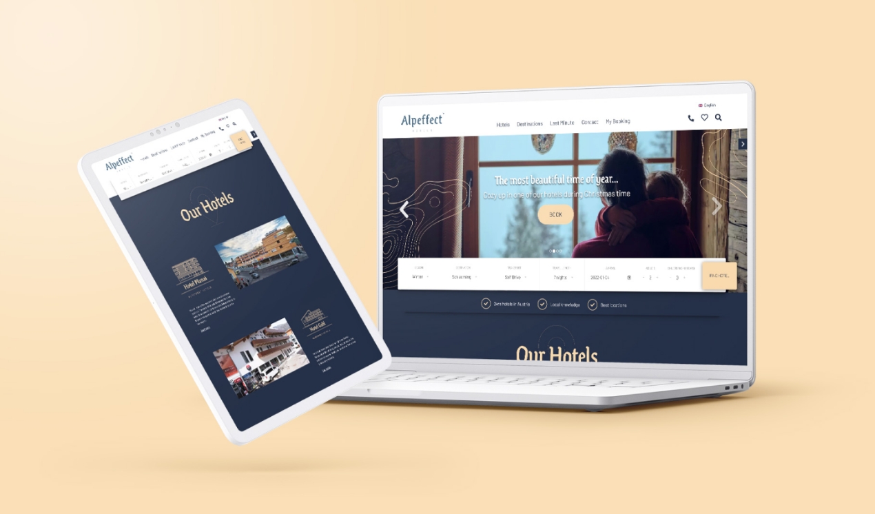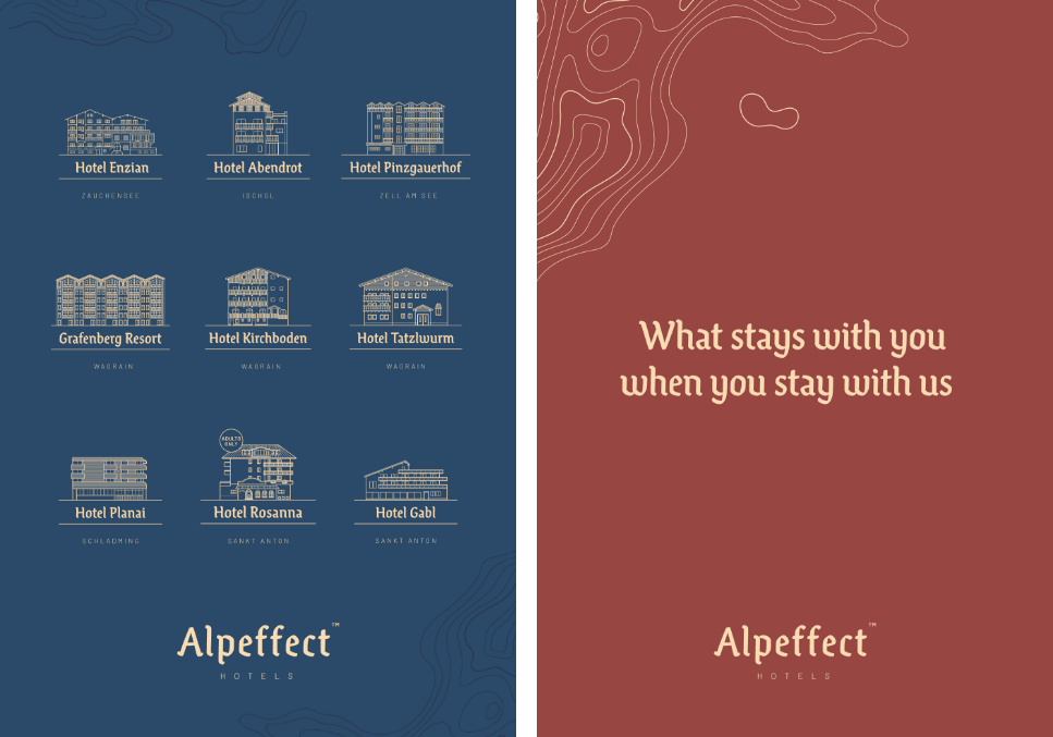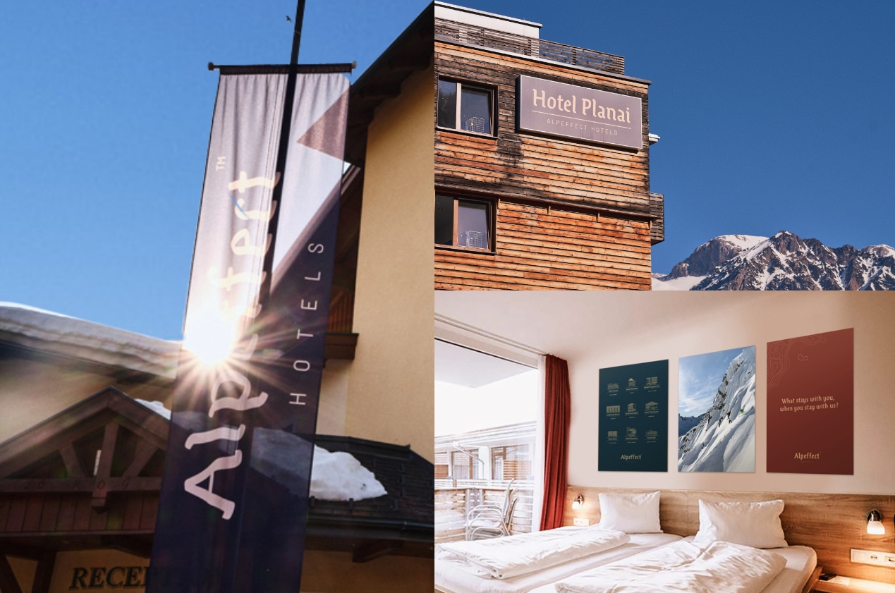 Beforehand every individual hotel operated under its own identity so the first task at hand was to find a name that could capture the common sensation of staying at one of the hotels – despite the hotels architecturally being very different. And even more important, we wanted to create a name that would embrace the unique feeling every visitor experiences and the physical and mental effect the alps can have on people visiting. And so arose the new hotel brand name: Alpeffect Hotels.